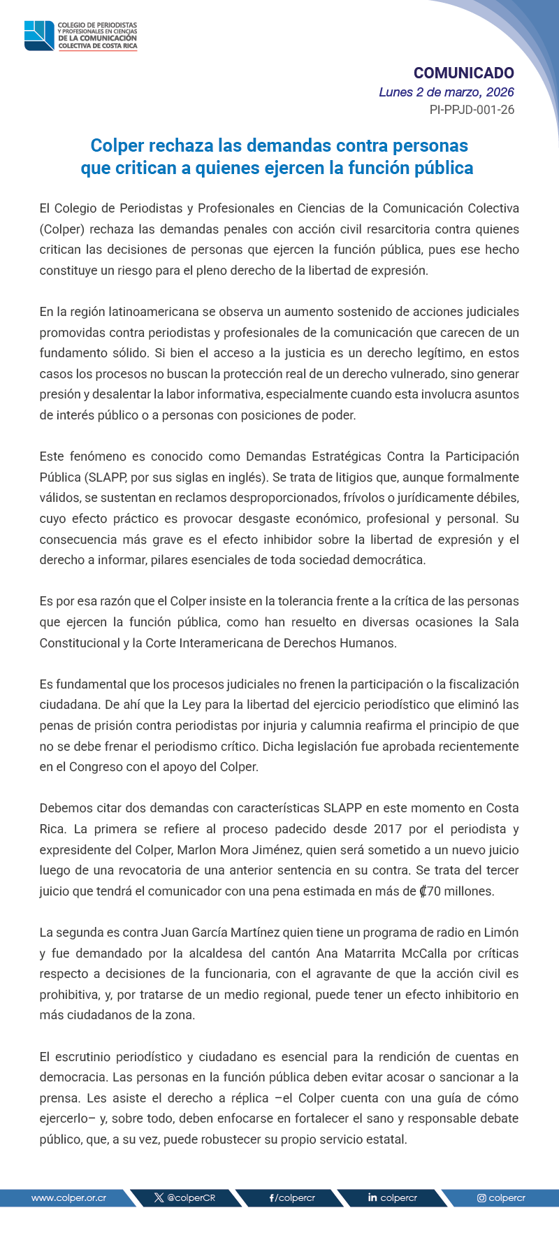 El Colegio de Periodistas y Profesionales en Ciencias de la Comunicación Colectiva (Colper) rechaza las demandas penales con acción civil resarcitoria contra quienes critican las decisiones de personas que ejercen la función pública, pues ese hecho constituye un riesgo para el pleno derecho de la libertad de expresión.